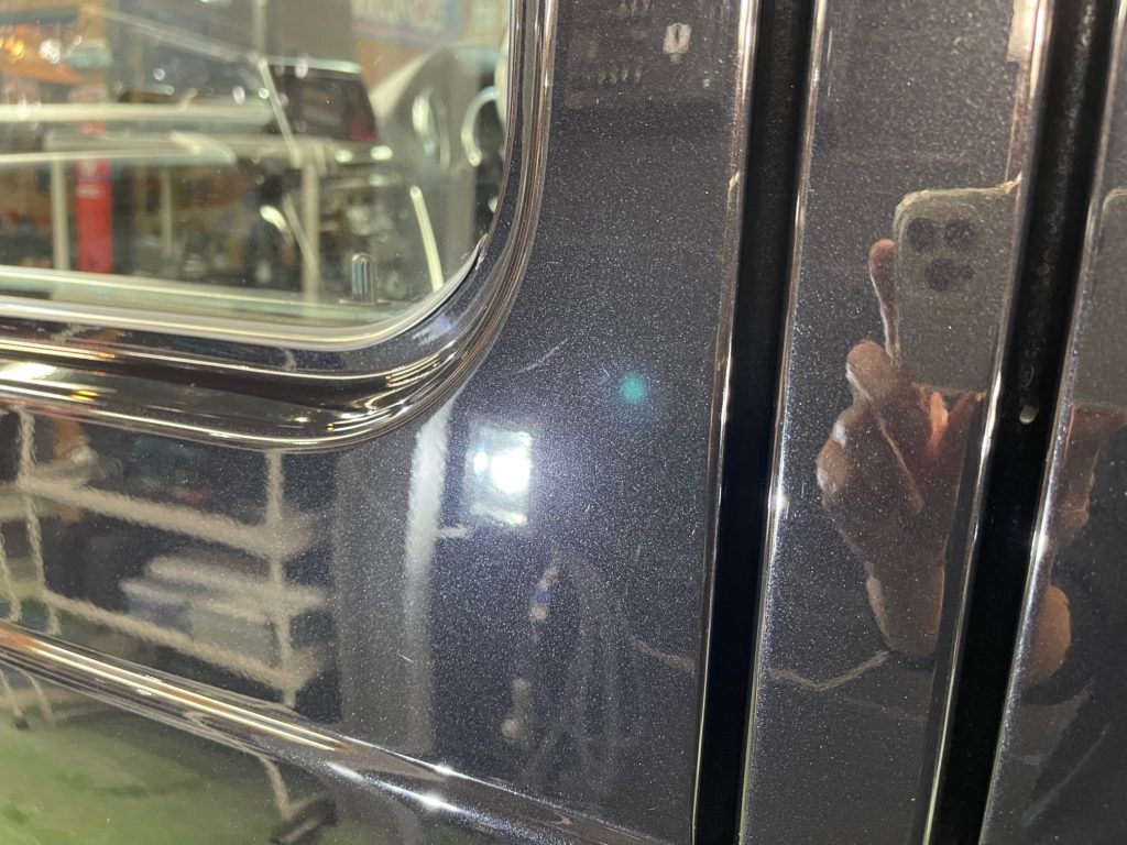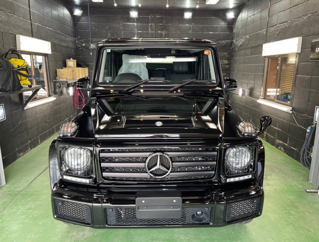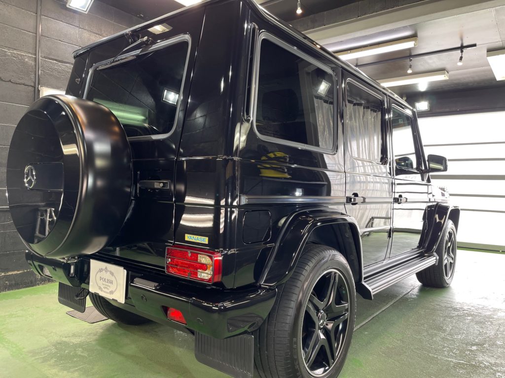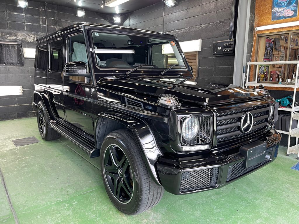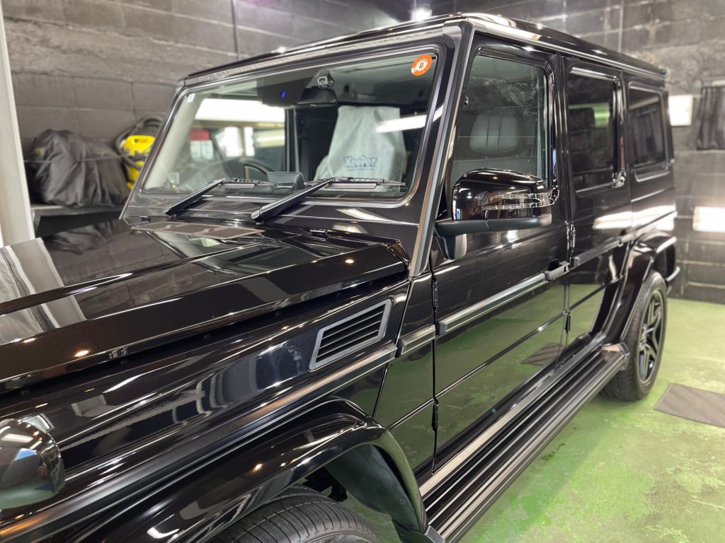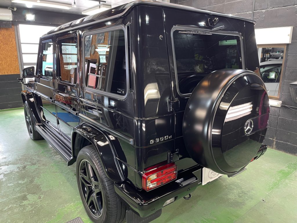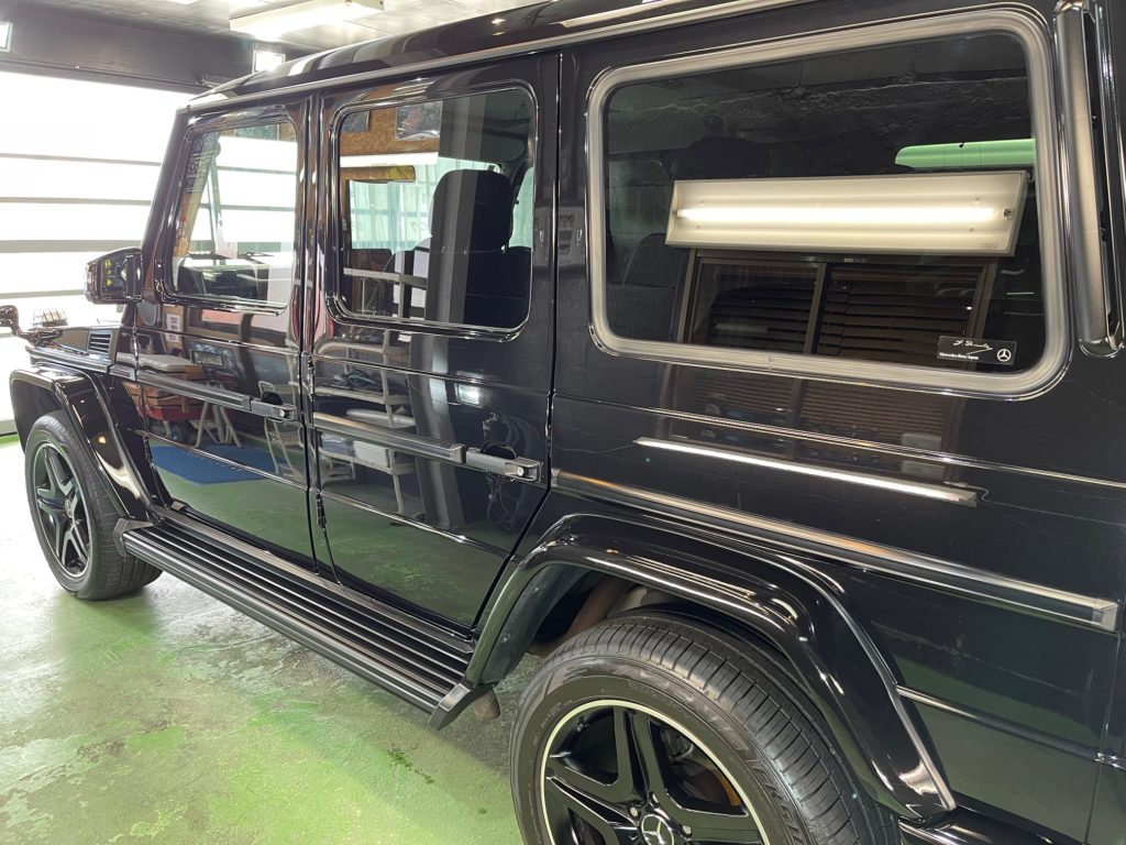 MERCEDES-BENZ G350d 3月の初めに塗装でお世話になったオーナー様より、窓ガラスのベタ付き除去(写真撮り忘れ、、泣)ボディ研磨作業、ボディガラスコーティング施工のご依頼です。