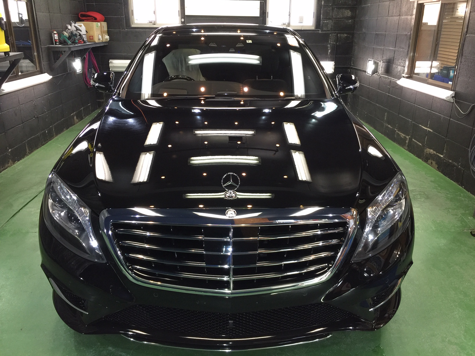 MERCEDES-BENZ S300h 当店にてボディガラスコーティングを施工をされているオーナー様より、部分施工のご依頼。ボンネット、F/Rフェンダーを塗装後、磨きキズ有(シングルポリシャーによる磨き痕)の為、光の乱反射で塗装面はモヤモヤです。適切な研磨作業で塗装面を整え、正反射化を行いコーティングの再施工です。
