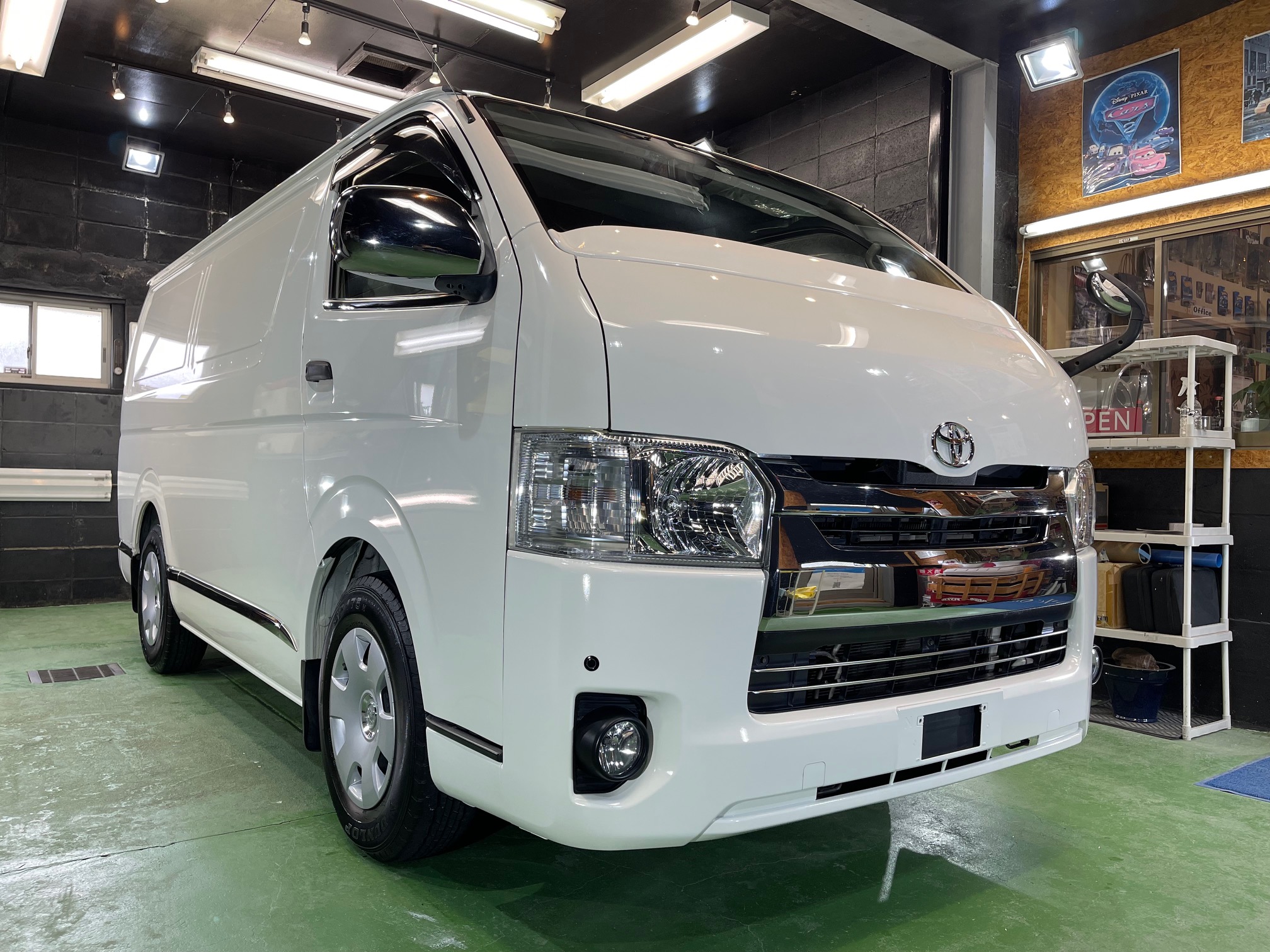 F3面以外のガラスは埋め込まれ、標準のHIACEよりも磨く面積は広く、洗車からコーティング施工まで約5日間程施工時間を要しました。確認されたオーナー様「凄いキレイ、新車みたい!これだと商売繫盛に繋がるね♪」と大変嬉しそうにお話しされ、「このキレイを今後も維持していきたい!」と洗車方法など聞かれました。遠方より施工ご依頼誠にありがとうございましたm(__)m