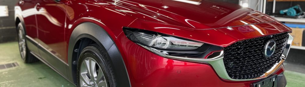 MAZDA CX-30 窓ガラスコーティング、ボディガラスコーティングポリッシュメンテナンスのご依頼です。新車から約4年、お仕事などで移動距離もあり忙しいオーナー様。普段の洗車は洗車機、洗車キズなど塗装表面を研磨作業で整えてのコーティング施工となりました♪