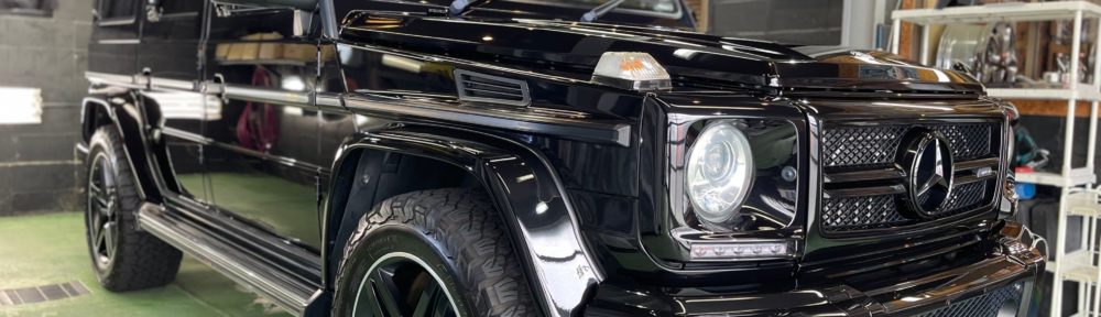 MERCEDES-BENZ G350d 新車から約8年、お世話になっていますオーナー様より、窓ガラスコーティング、ボディガラスコーティング定期メンテナンスご依頼です。濃色車に見られるボディの雨染みやスケール染み、専用のケミカルを使用してスケール染みの除去後はポリッツシュメンテナンス~コーティング施工+トップコート施工でメンテナンス完了です!