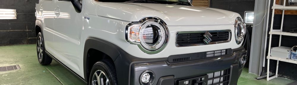 SUZUKI HUSTLER お世話になっていますオーナー様より、窓ガラスコーティング、ボディガラスコーティング定期メンテナンスのご依頼です。雨上がりには必ず洗車をされトップコートもセルフにて施工されているオーナー様。野外駐車(高架線近く)のため上面部には軽度のシミや鉄粉の付着などポリッシュメンテナンスなどで除去し整えます!