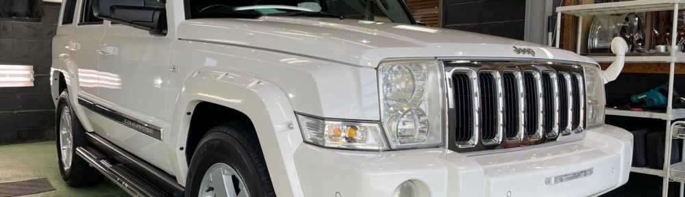 JeeP COMMANDER お世話になっていますオーナー様より、ボディガラスコーティング定期メンテナンスのご依頼です。今回は窓ガラスのウロコ染みが気になられると言う事でFガラス以外(Fガラスは以前施工済み)全面のウロコ染み除去+窓ガラスコーティング施工です。