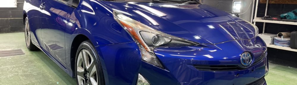 TOYOTA PRIUS お世話になっていますオーナー様より新車から毎年の定期メンテナンスも欠かさずに、窓ガラスコーティング、ボディガラスコーティング定期メンテナンスのご依頼です。洗車の頻度も少なめで野外駐車、樹脂部分やプラスチック部の劣化、塗装面の傷みはあるものの、、適切な研磨作業ポリッシュメンテナンスで光の正反射化を行いな塗装面を整えコーティング施工です!