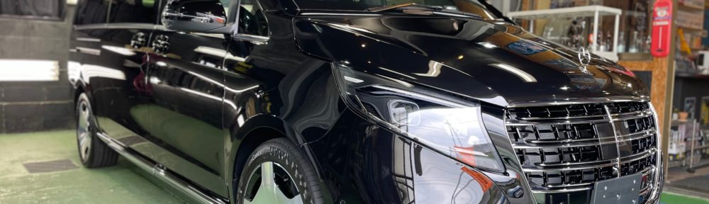 MERCEDES-BENZ V220d Extra-long “Black Suite” 大変お世話になっておりますオーナー様より、旧型から新型Vクラスへのお乗換えにて納車後直ぐに当店へ。ヘッドライトプロテクション、窓ガラス全面コーティング、ボディガラスコーティング施工のご依頼です。新車からの施工濃色車でこのサイズは圧巻でした!