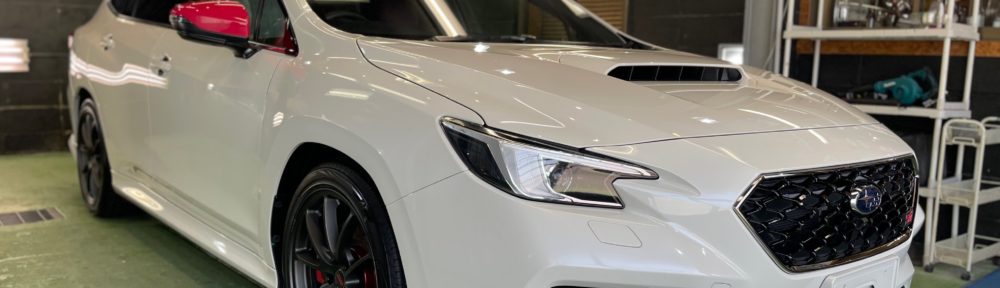 SUBARU LEVORG STi 「ここの前の道はいつもよく通ってて、どんな兄ちゃんがされてるのかと気になって寄って見ました!」と新規のオーナー様より、ホイールコーティング、ヘッドライト左右プロテクションフィルム、Rガラス油膜、ミスト除去+Rガラスコーティング、ボディ異物除去研磨作業+ボディガラスコーティング施工のご依頼です。