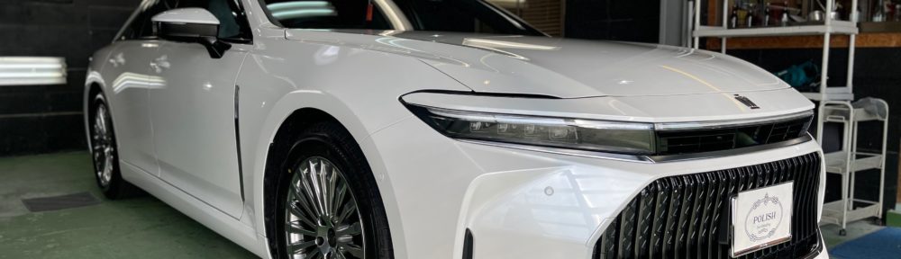TOYOTA CROWN お世話になっていますディーラー様より、窓ガラス全面コーティング、ボディガラスコーティング施工ご依頼です。昨年の7月にお問い合わせ頂き今年の1月に納車され今月当店へご入庫。窓ガラスの油膜取り軽度のウロコ除去、ボディへの異物付着除去、研磨作業とボディガラスコーティング+トップコート施工で新車以上の艶と輝きになりました♪
