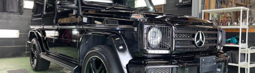 MERCEDES-BENZ G350d 3月の初めに塗装でお世話になったオーナー様より、窓ガラスのベタ付き除去(写真撮り忘れ、、泣)ボディ研磨作業、ボディガラスコーティング施工のご依頼です。