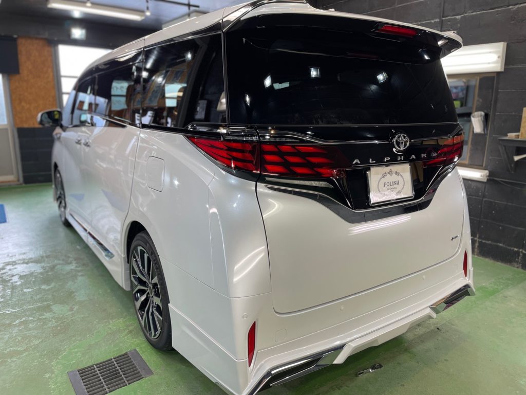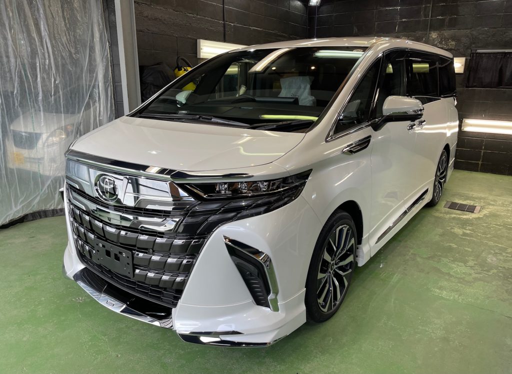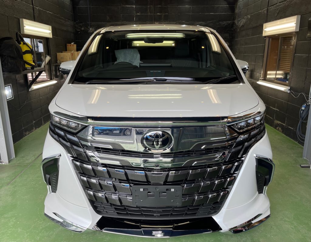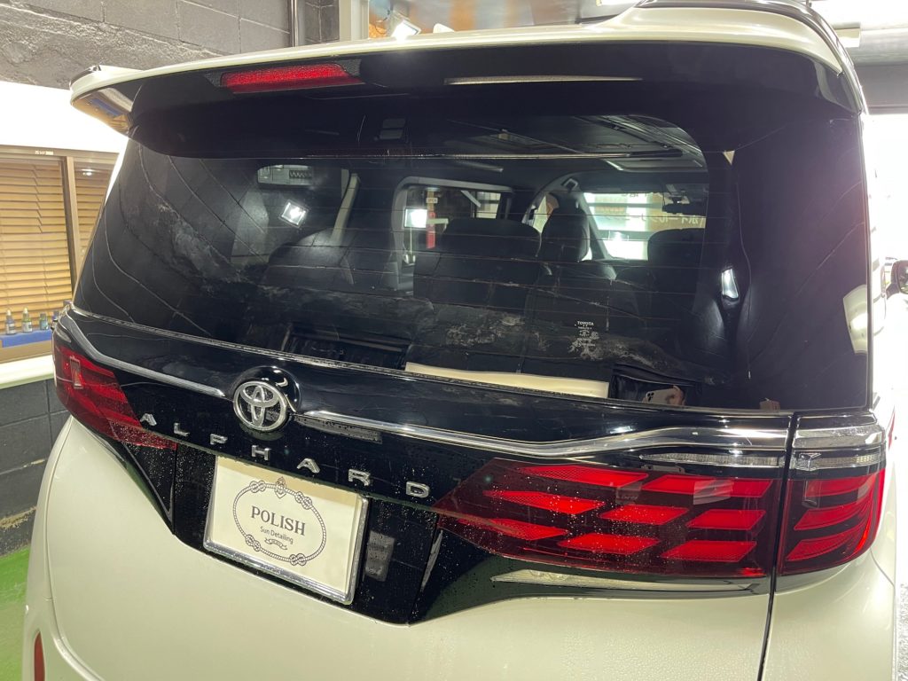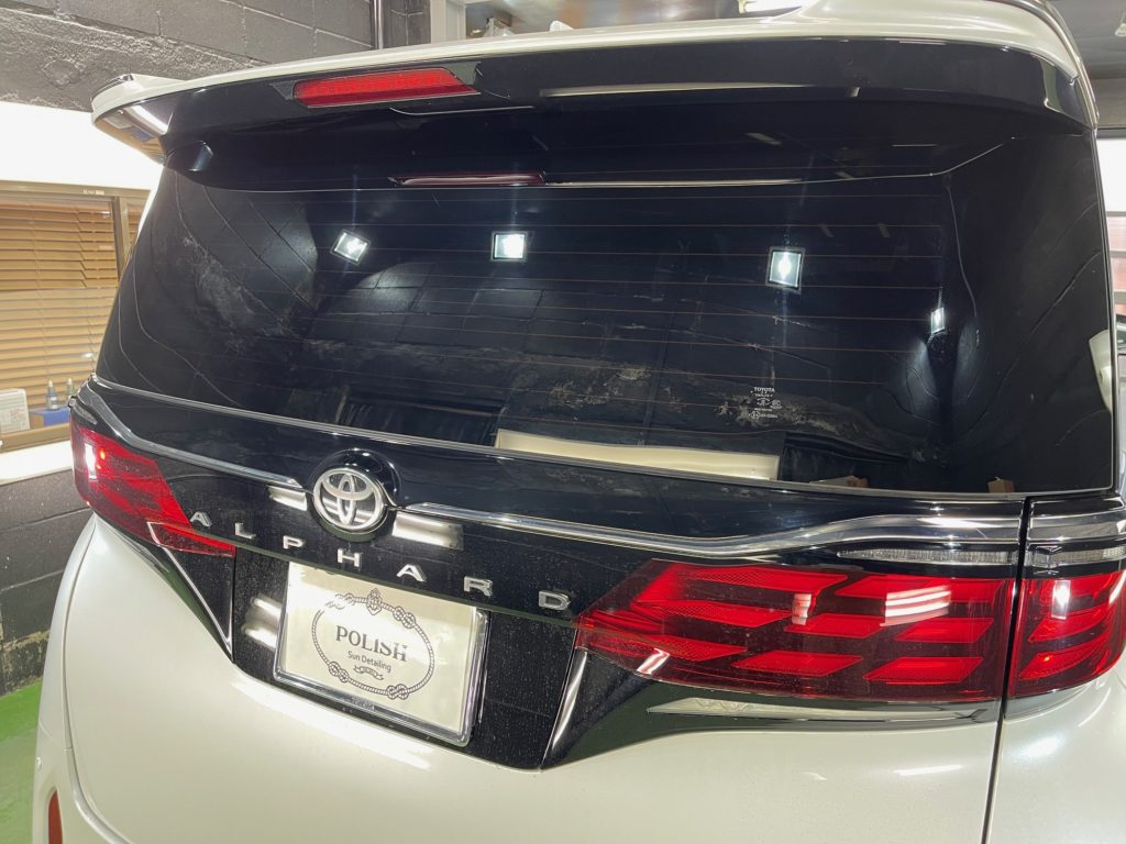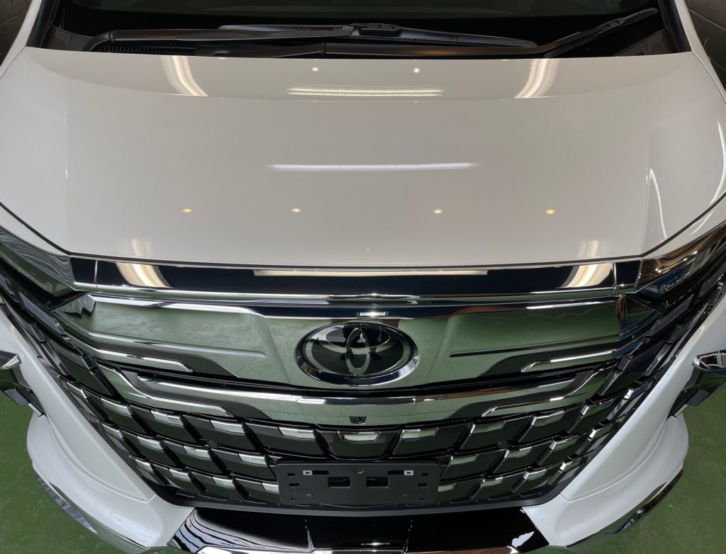 TOYOTA ALPHARD 同級生のオーナー様より、窓ガラス全面コーティング、ボディガラスコーティングのご依頼です。今年の6月に購入のご連絡をいただき予想よりも早く3ヶ月程で納車、ディーラーからそのまま当店へご入庫。ボンネットやルーフにはキズ防止のラッピングシートが貼られ洗車前に丁寧に剥がし、窓ガラスの油膜取り、洗車~研磨作業、脱脂作業~窓ガラスコーティング、ボディガラスコーティング施工と新車以上の艶と輝きになりました♪
